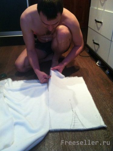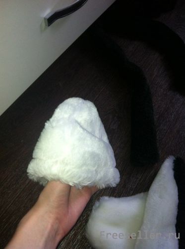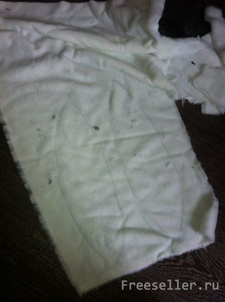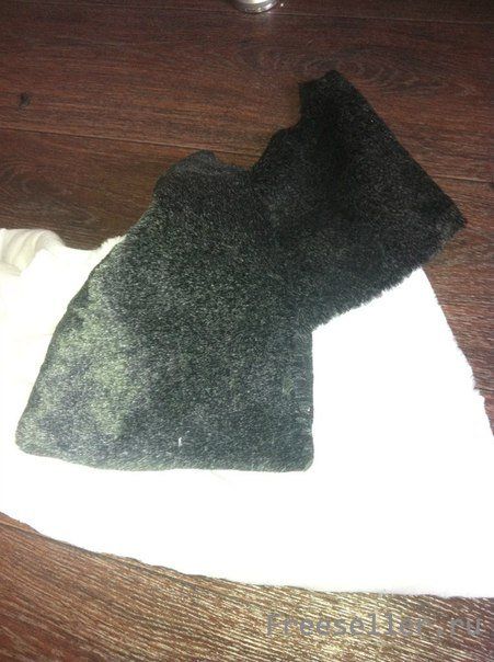 К купленному материалу мы прикладывали готовый и обводили его карандашом, абсолютно на глаз, так как маленькие дефекты пошива не заметны благодаря толстому ворсу выбранного материала.
