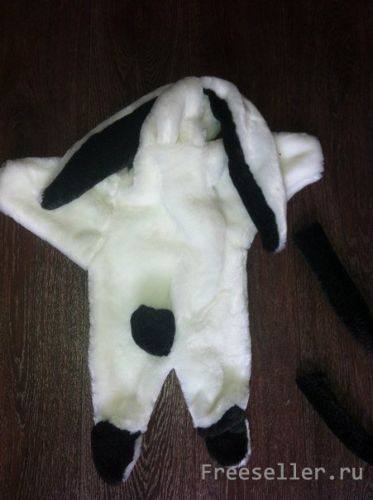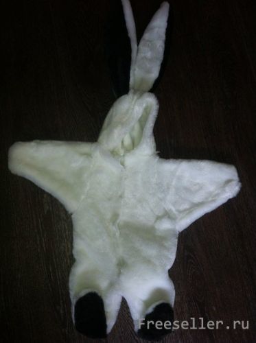 Затем вырезали, отдельно основную часть - от плечиков до ножек, оставили разрез, чтобы вставить пуговички (хотя я бы советовала вставлять молнию, на своем опыте убедились, что пуговки не очень удобно), отдельно ручки, лапки, капюшон, ушки и хвостик.