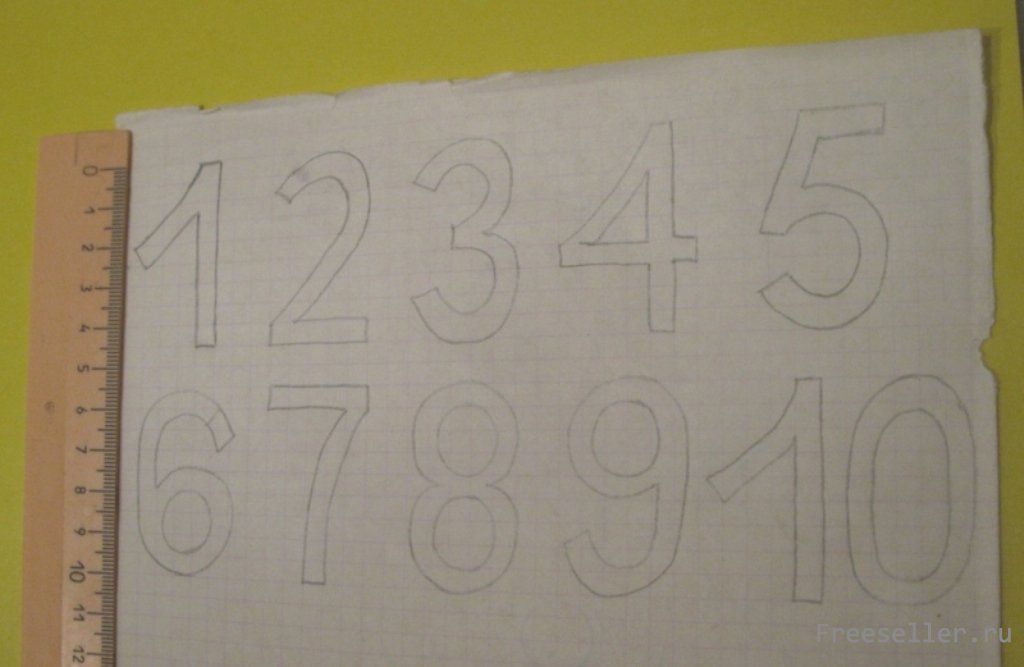 3 - на клеточной бумаге рисуем цифры, которые впоследствии вырезаем и обводим на обратной стороне цветного картона (не забудьте повернуть трафарет, чтобы изображение цифр получилось верным);