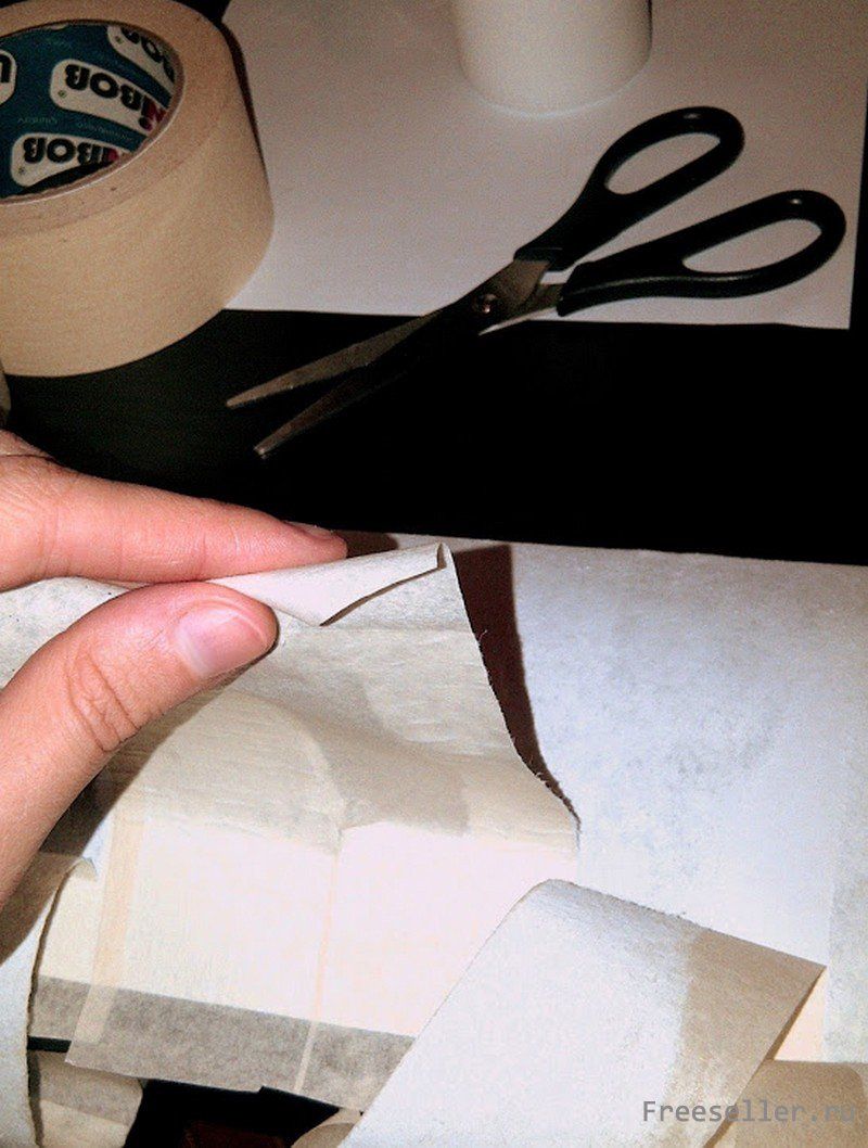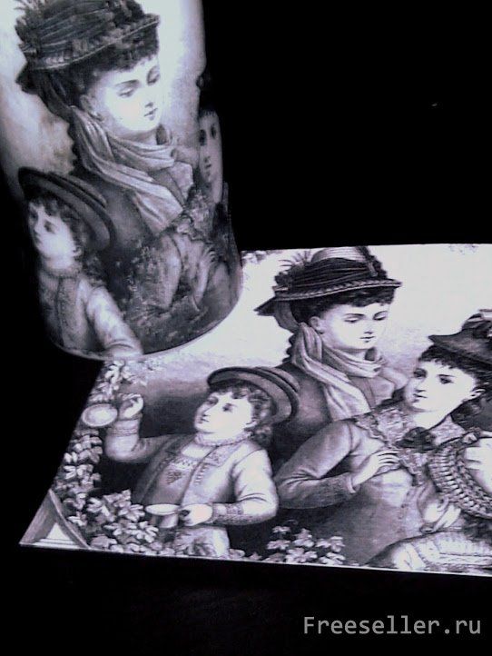 Готовим изображение для декупажа: переворачиваем картинку обратной стороной и наклеиваем на бумагу полоски скотча. Затем, аккуратно снимаем. Вместе со скотчем должны отрываться и тонкие полоски самой бумаги. Она должна стать тонкой, как салфетка.