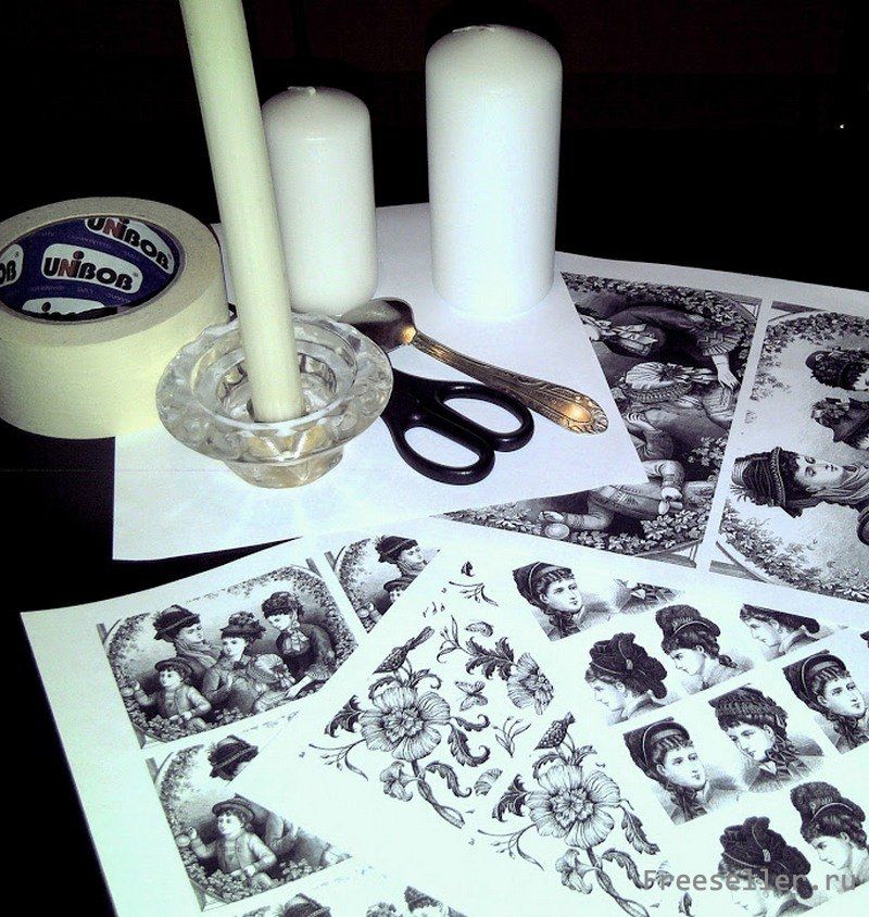 Вырезаем изображения по размеру. Прикладываем к свече и фиксируем.