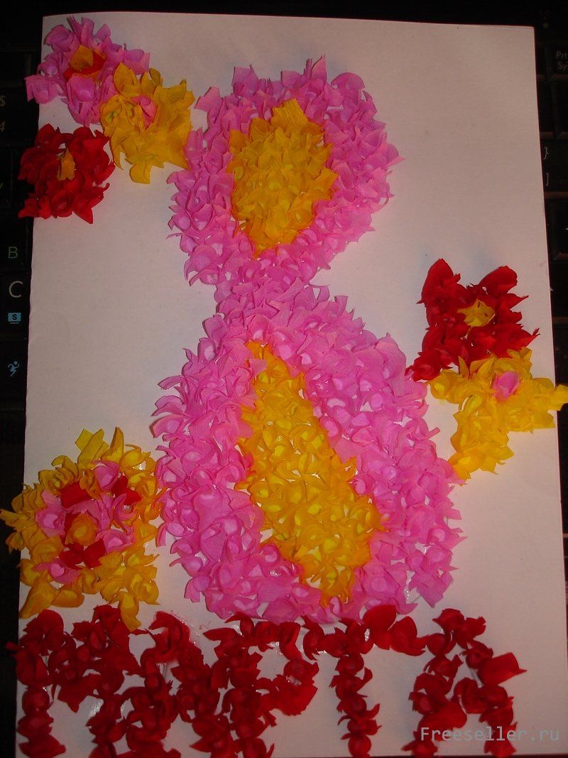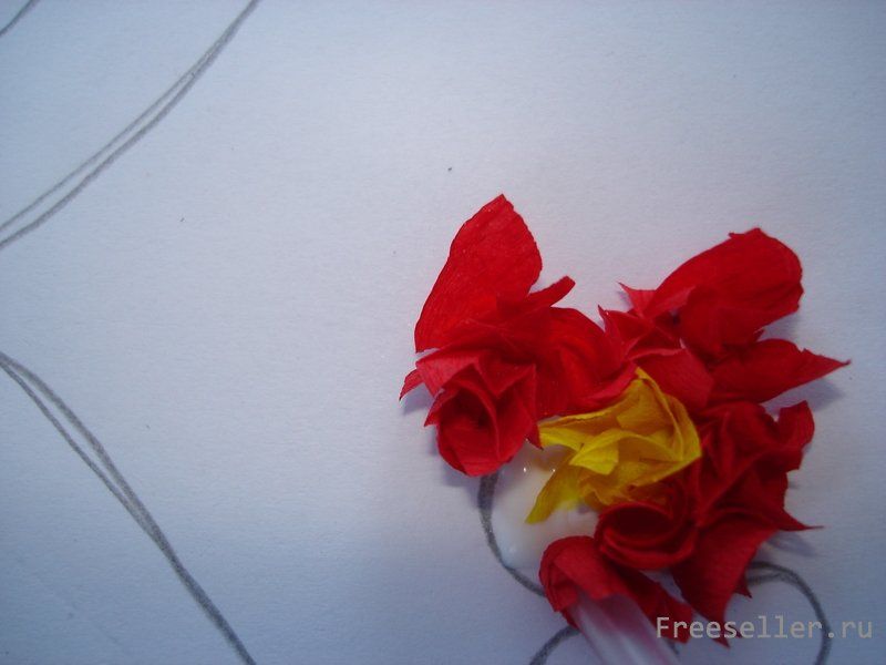 Далее скрученный квадрат приклеиваем к цветку. И таким образом по порядку обклеиваем весь цветок скрученными бумажными квадратиками. То же самое делаем с остальными цветами.