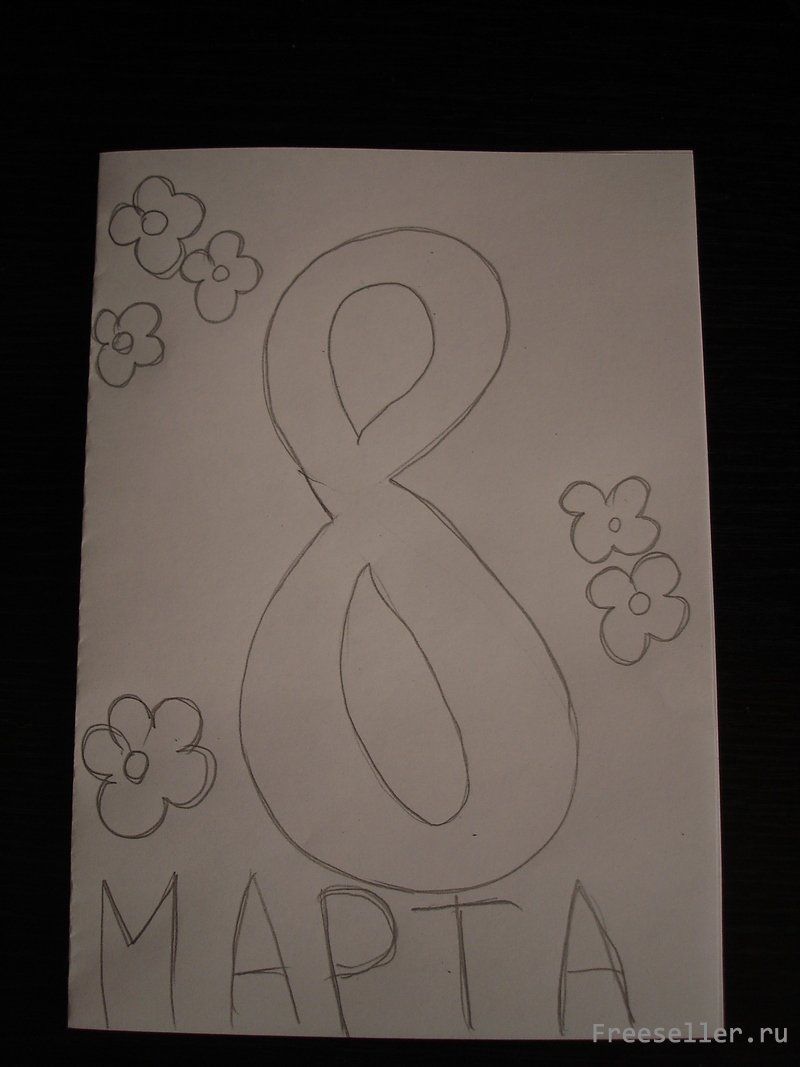 Делаем открытку произвольной формы из чистого листа бумаги. На лицевой части рисуем цветы и надпись – 8 марта.