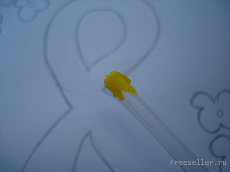 Начинаем с цветов. На один из них наливаем клей. Затем берем в руки стержень и на его тыльную сторону накручиваем один квадратик гофрированной бумаги.