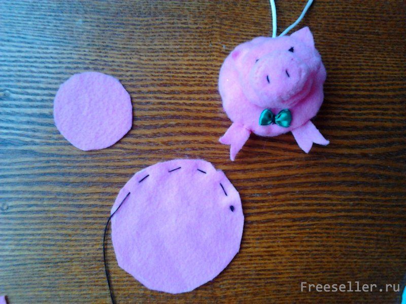 И пришиваем пятачок на мордашку хрюшке наполняя его синтепоном. Далее соединяем наш круг-туловище с кругом-головой.
