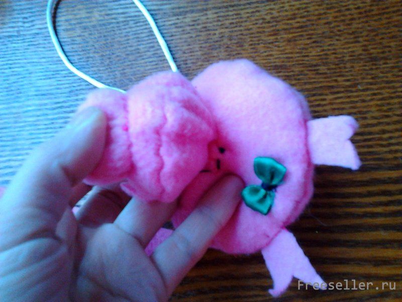 Не забываем про петельку, чтоб можно было её подвесить. Вышиваем на пяточке ноздри, на мордашке глазки. Для красоты можно пришить бантик, бабочку.