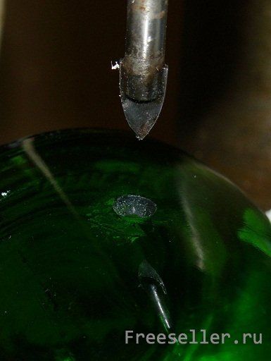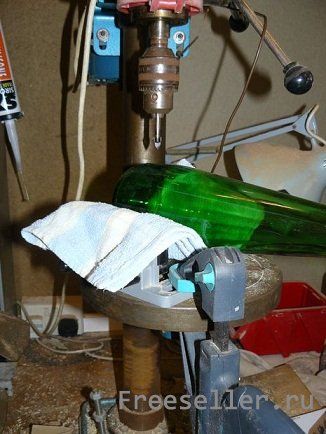 Самым сложным в изготовлении такого светильника-бутылки будет высверливание отверстия для провода. Именно с этого и стоит начать. Удобнее всего для этих целей использовать специальный станок.