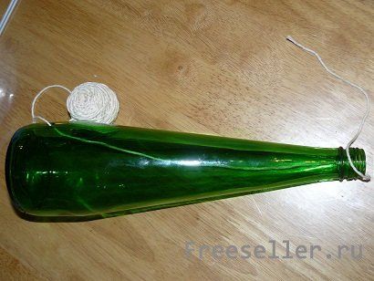 Когда отверстие в стенке бутылки готово, возьмите моток ниток и протяните нить в высверленное отверстие так, чтобы нить вышла через горлышко бутылки.