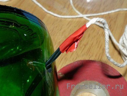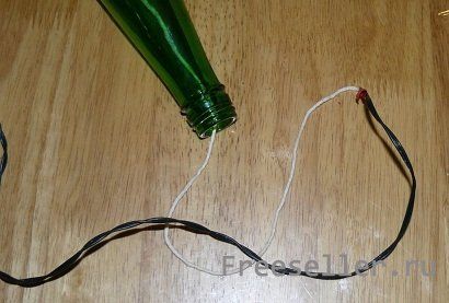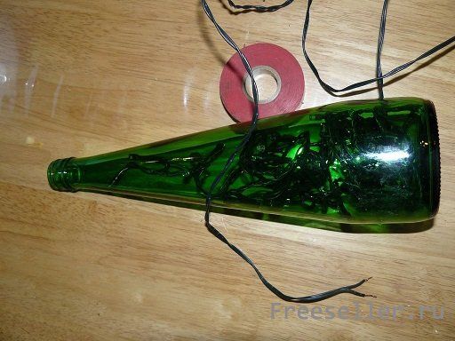 Нить крепко связываем с концом гирлянды от которой временно отрезан штекер и блок переключения. Аккуратно за нить тянем проволоку, чтобы ее конец вышел из высверленного отверстия, а вся гирлянда разместилась бы в бутылке.