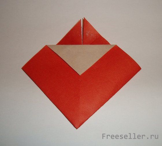 Складываем острый угол вовнутрь и получаем ромбик. Переворачиваем и загибаем острый угол цветом вовнутрь.