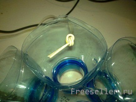 Чтобы ее можно было подвесить, отмечаем те бутылки, в которых нужно сделать отверстия и закрепить проволочные держатели на узел.