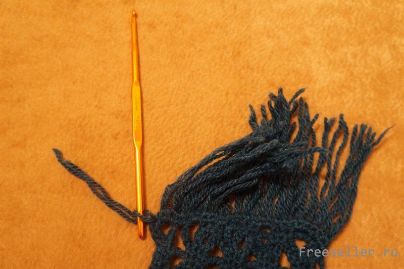 4. Делаем бахрому. Для этого нарезаем нитки по 25 см, протягиваем их по краям шарфа с обеих сторон.
