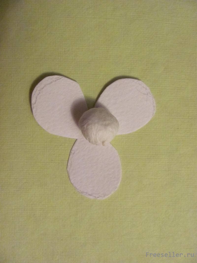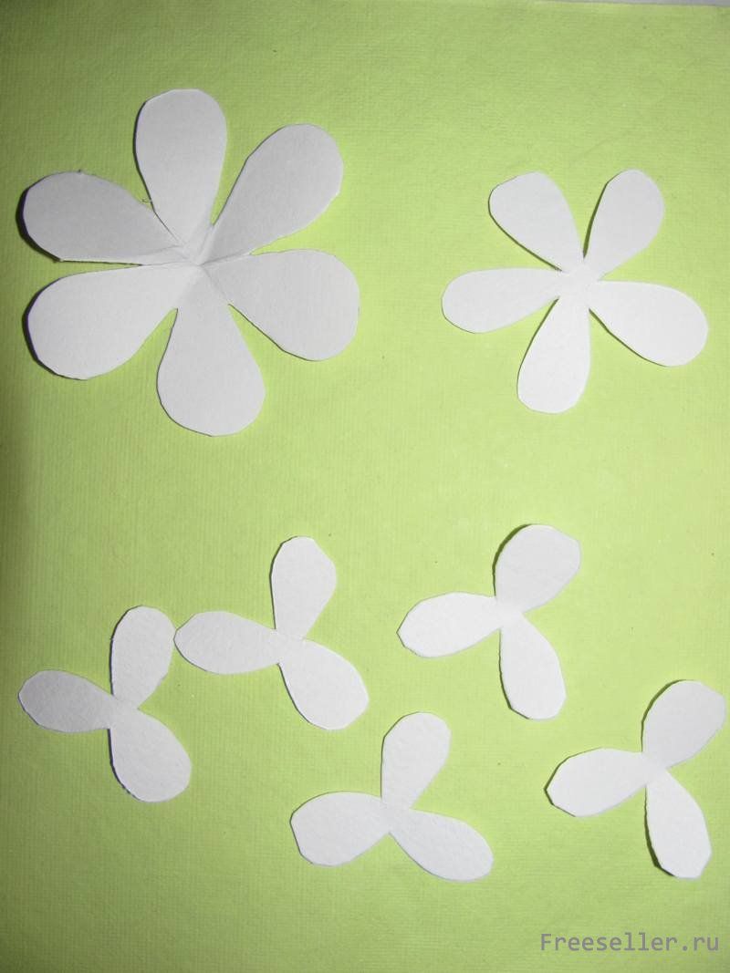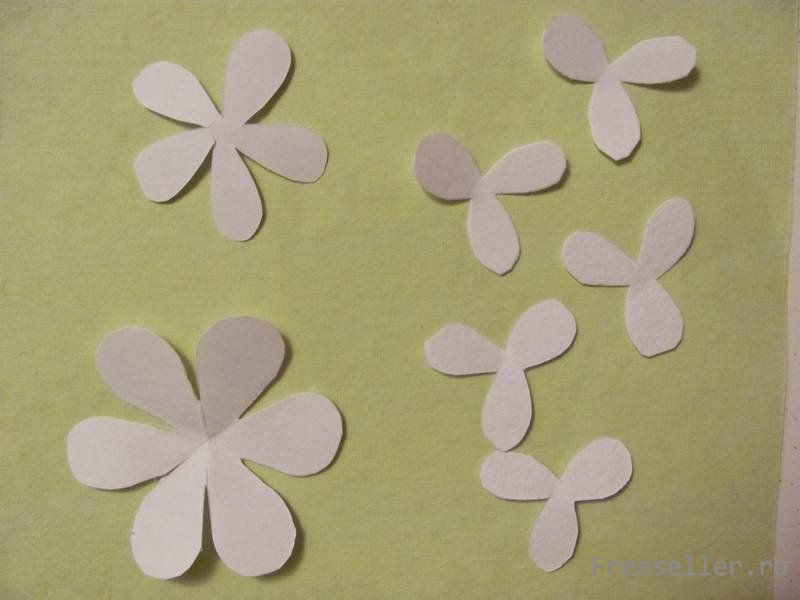 для одного цветка 1 шт. цветок с шестью лепестками (должна быть самой большой по размеру), 1 шт. цветок с 5 лепестками (меньшего размера) и 5 заготовок с 3 лепестками (небольшого размера).