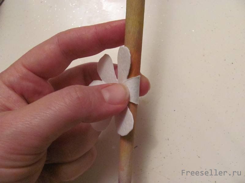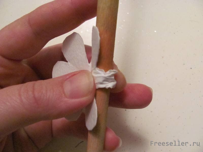 3. Пока заготовки влажные, намотайте каждый лепесток на толстую кисточку, как показано на фото и двумя пальцами сплюсните его.