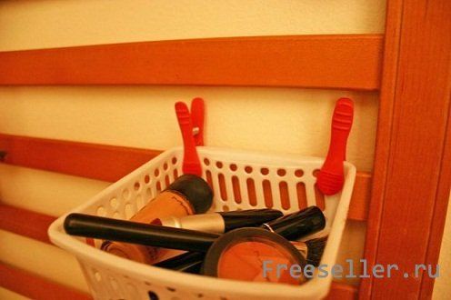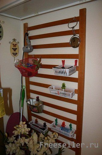 Основание кроватки в целом или распиленном пополам виде разместите на стене в кухне или ванной комнате для того, чтобы при помощи крючков и даже прищепок разместить на нем множество нужных вещей.