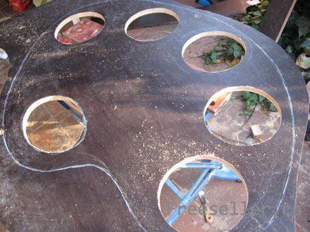 Нарисуйте на фанерном листе форму палитры и расположите в ряду "красок" отверстия под горшки.