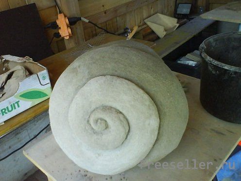 Из трех частей песка, одной части цемента и воды до густоты сметаны приготовим раствор, которым заполним сетку и выложим завитки домика улитки. Дадим всему этому подсохнуть.