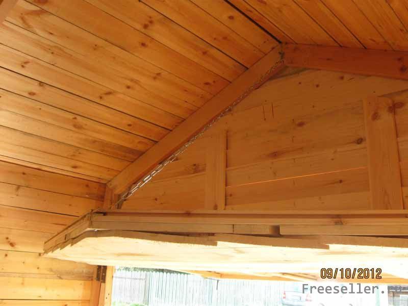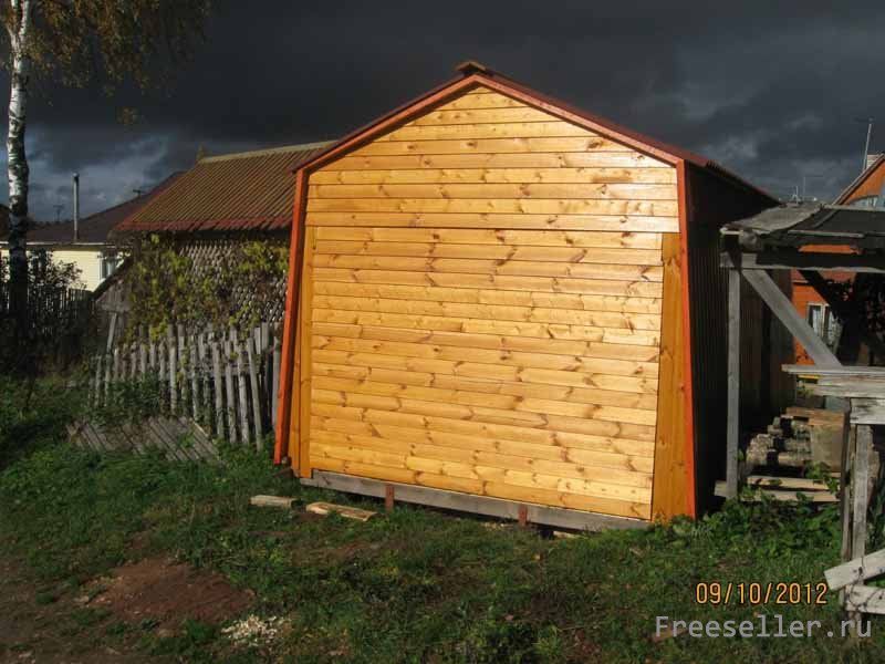 Гараж по наружной стороне стропил обшит строганой доской и металопрофилем, крыша- андулин.