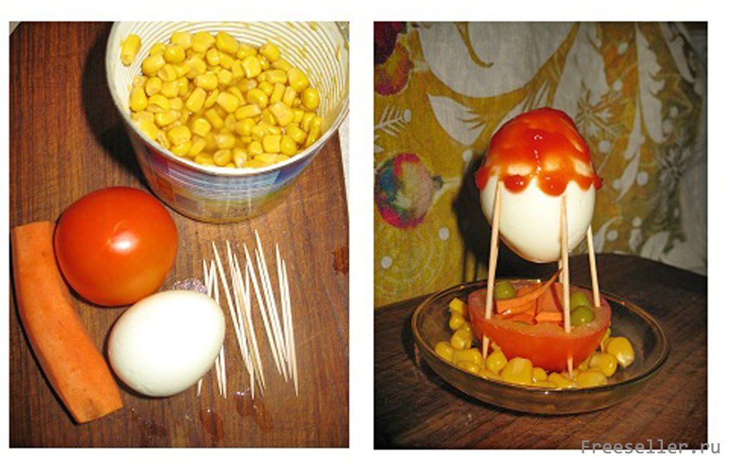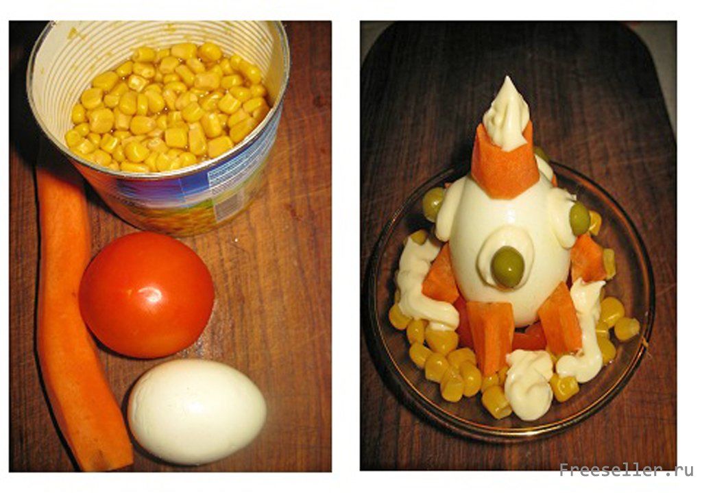 "Ракета". Понадобятся яйцо, зеленый горошек, 1/4 моркови, майонез, кольцо помидора, кукуруза. На блюдо высыпаем кукурузу (взлетно-посадочная площадка), кладем кольцо помидора, очищенное от сердцевины (база для взлета), ставим в него яйцо (ракета), из моркови вырезаем 6 остроугольных треугольников (верхушка и ракетоносители), верхушку и низ ракеты (пары дыма) украшаем майонезом, из него же и горошен делаем на боках ракеты иллюминаторы.