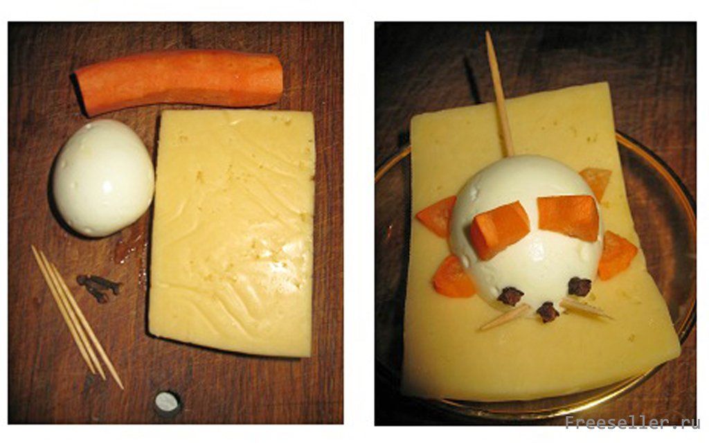 Фигурка "Мышка". Потребуются яйцо, ломтик сыра, 2 зубочистки, 1/4 моркови, 3 гвоздички. Яйцо разрезаем пополам, кладем на сыр (туловище), из моркови вырезаем 6 треугольников (уши и лапки) и накладываем их вверх и по бокам, 1 зубочистку вставляем в "попку" яйца (хвост), а вторую делим на две и вставляем в "носик" яйца (усы), оформляем глаза и нос мыши из гвоздики.