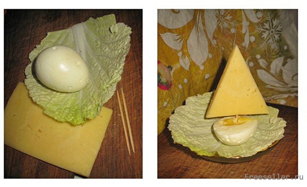 "Кораблик". Понадобятся лист салата или пекинской капусты (море), половина яйца (днище), зубочистка (мачта) и кусочек сыра (парус).