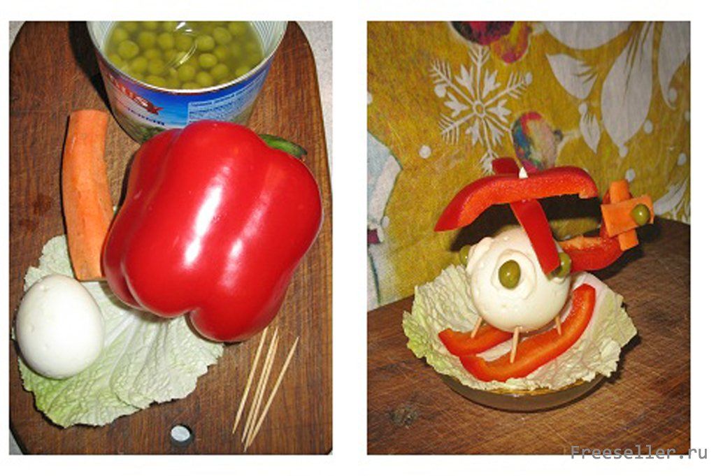 "Вертолет". Делаем посадочную площадку из листа капусты, шасси - полоски перца+зубочистки, на них ставим вертолет (яйцо), пропеллеры сверху и хвост тоже из перца, пропеллер на хвосте - морковь и горошина, насаженные на зубочистку. С помощью майонеза и гороха рисуем иллюминаторы.