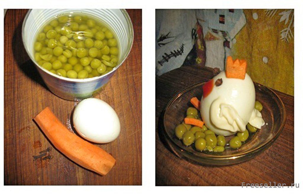 "Цыпленок". Садим яйцо (цыпленка) на полянку (горошек), гребешок и лапы делаем из моркови, глаза - из гвоздики, клюв рисуем кетчупом, а крылья и хвост - майонезом.
