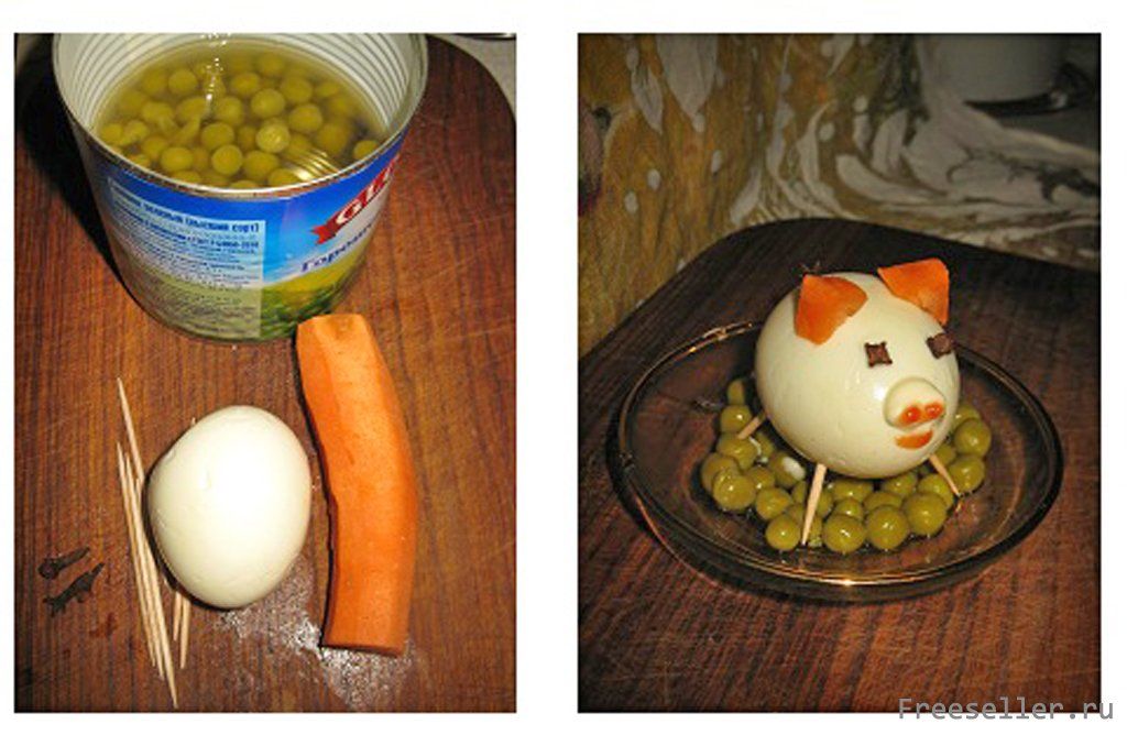 "Свинка". Нужно яйцо, 2 зубочистки, майонез, кетчуп, 3 гвоздички, 1/6 моркови, горошек. Делаем полянку из гороха, в яйцо вставляем глаза и хвост из гвоздик, ноги - разломанные пополам зубочистки, сверху кладем 2 треугольника из моркови (уши), пяточек рисуем майонезом и кетчупом.