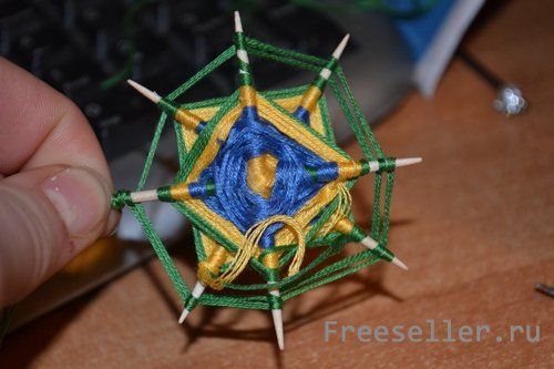 5. Теперь их нужно соединить. Привязываем нитку к нижнему концу креста и просто обматываем каждый кончик, сначала мандала будет немного ерзать, но потом закрепится.