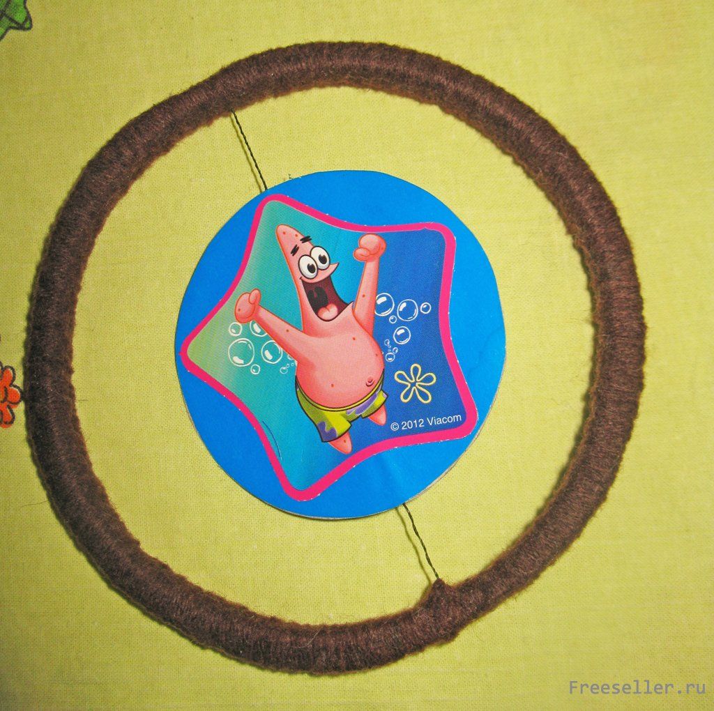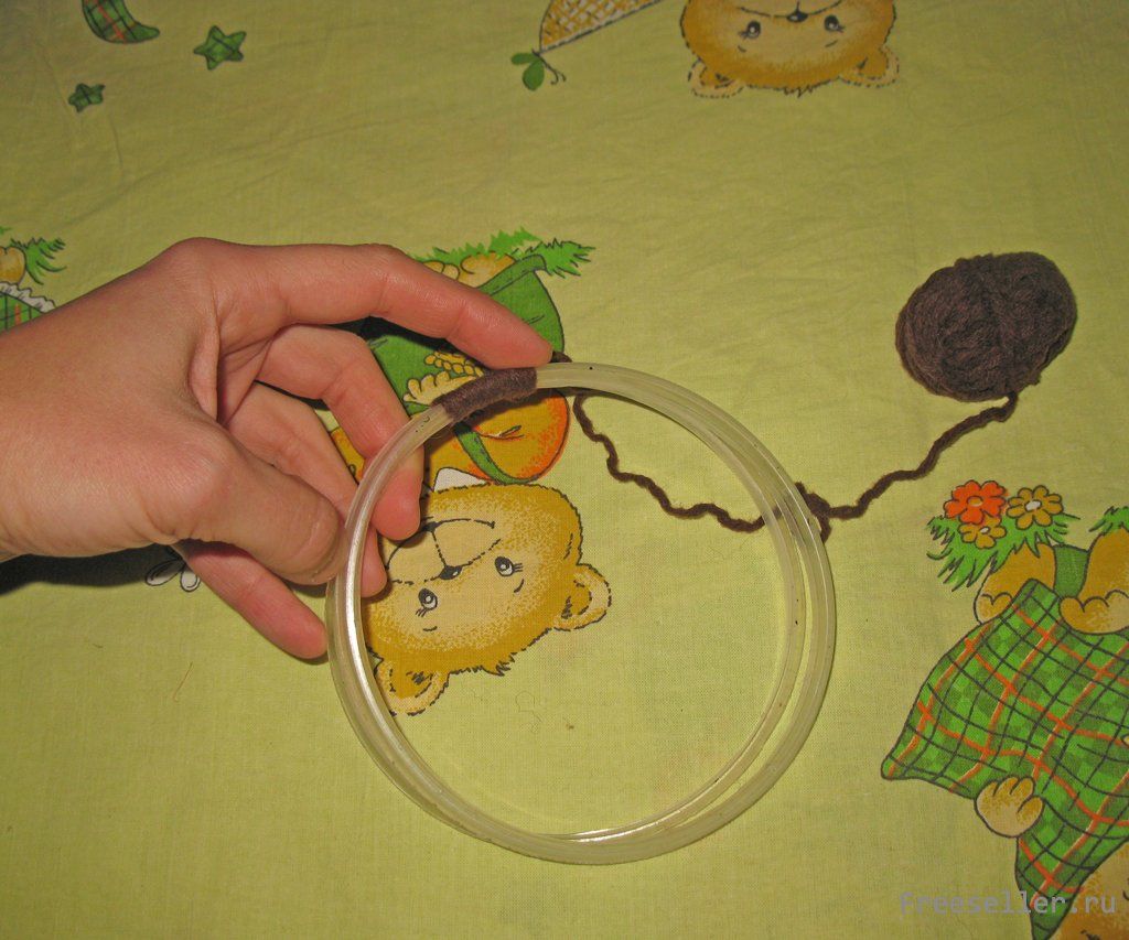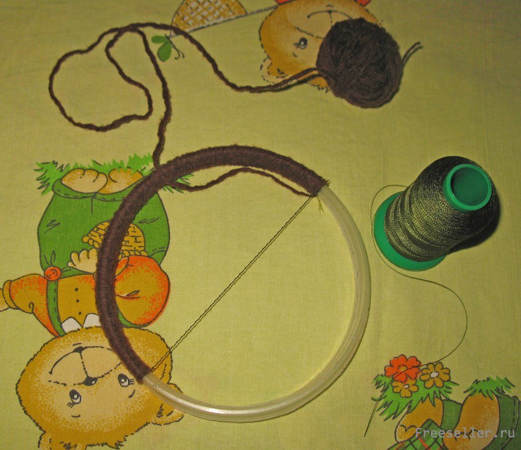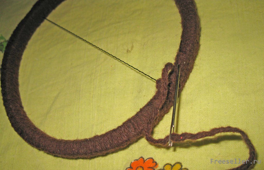 3- обматываем вторую половину обруча, конец нитки прячем в основе с помощью иглы;