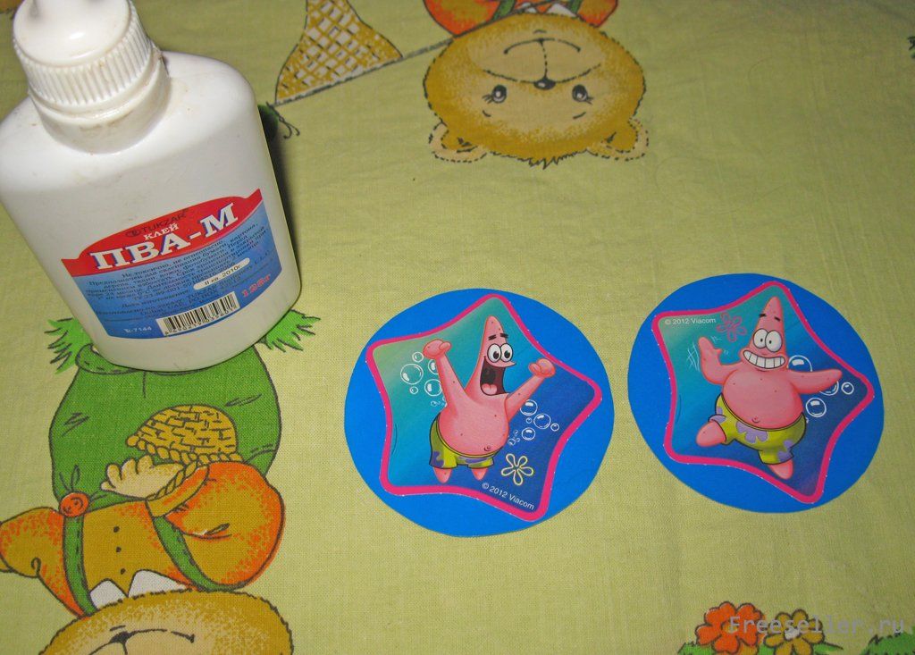 4 - вырезаем из детского журнала картинки, одинаковые по величине и, желательно, с одним и тем же персонажем, но в разных ракурсах, с разным выражением лица или делающим какие-то разные движения, вырезаем круги из цветного картона (диаметр меньше обода) и приклеиваем к ним картинки;
