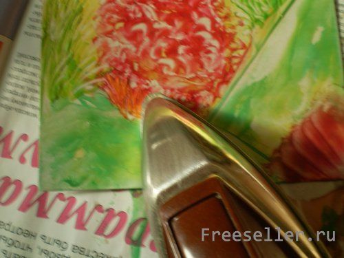 Утюг без функции отпаривания, восковые карандаши и глянцевый картон.