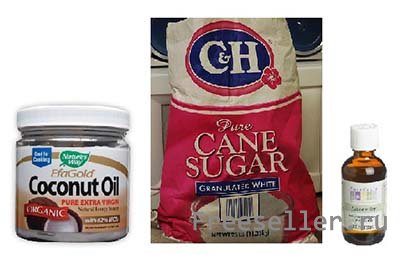 Для первого рецепта возьмем 2 части сахара и 1 часть кокосового масла, тщательно разотрем ингредиенты, добавим 3-4 капли любого эфирного масла, опять все перемешаем и поместим в закрывающуюся стеклянную баночку.