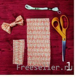 Для изготовления нам понадобится лоскут ткани, нитки с иглой и ножницы. Из ткани вырезаем прямоугольник у которого длинная сторона вдвое больше короткой. В готовом виде длина бантика будет на половину меньше длины исходного прямоугольника. Для перемычки вырезаем прямоугольник 6*4 см.