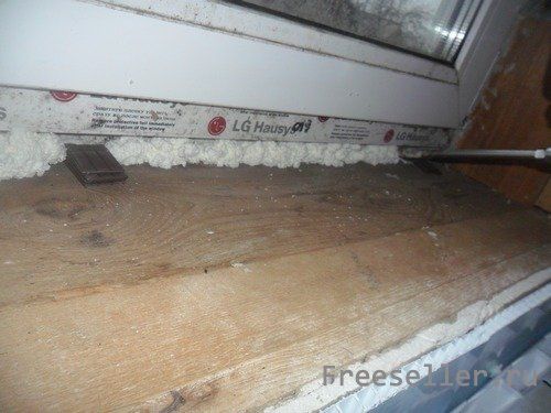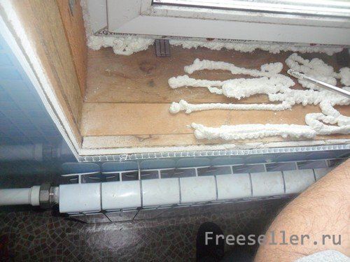 Запеним монтажной пеной. После этого, надо положить на подоконник тяжелый груз, чтобы его не выгнуло вверх. Через сутки груз можно убрать.