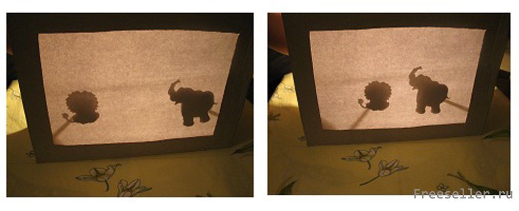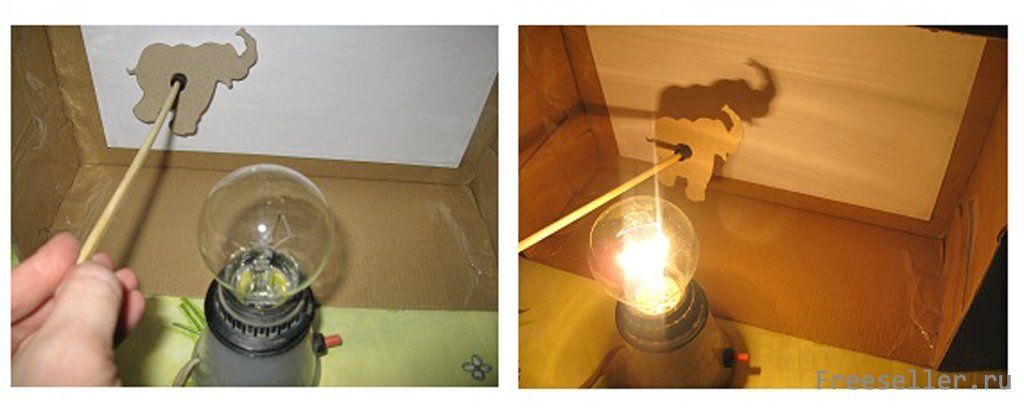 4 - за коробкой располагаем лампу яркого света и подносим фигурки к экрану с обратной стороны.