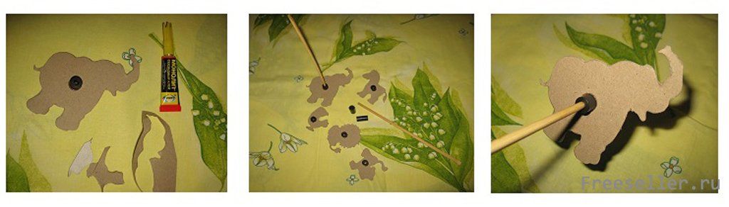 2 - разрезаем пластмассовую трубку на небольшие колечки (если таковой нет в наличии, просто используем пластилин), приклеиваем их к основе фигурок, затем втыкаем палочку;