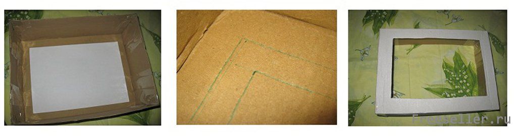 3 - делаем экран: укрепляем картонную коробку скотчем по углам (если она слишком хлипкая), на дно кладем лист А4, обводим, затем внутри очерчиваем еще прямоугольник с меньшими размерами, вырезаем дырку (по внутреннему контуру) и приклеиваем экран (внутри коробки);
