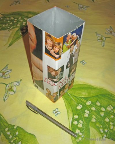 3) Наклеиваем вырезки (как вам больше нравится), заполняя всю поверхность пачки, лишний клей убираем салфеткой (сначала вид будет не очень презентабельный - рисунок на пачке просвечивает, картинки вздывлены и с пузырями воздуха, но когда ваза подсохнет, то все изменится