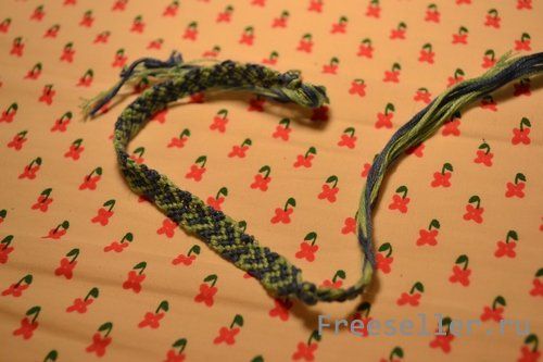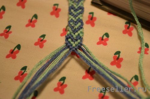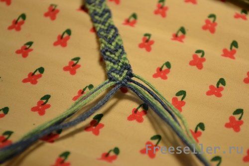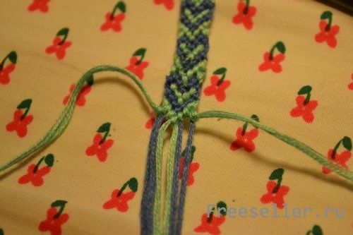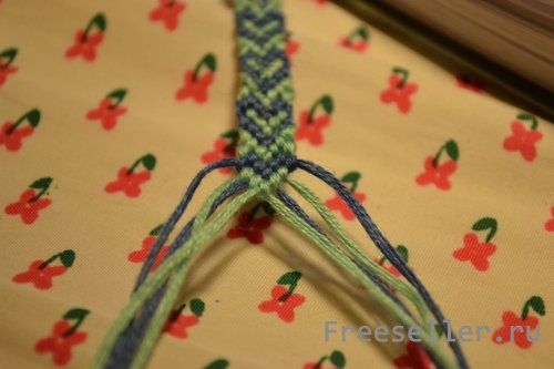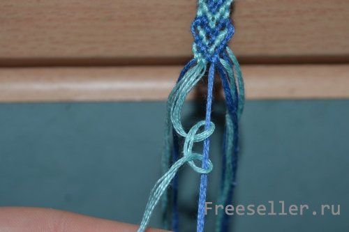 Плетем бирюзовыми, как на фото. Теперь синими оплетем и сплетаем две по середине, оплетаем до конца , закрепляем узелками.