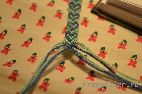 И начинаем плести первой бирюзовой ниткой, 3 остальные, до синей серединки, потом бирюзовой. С другой стороны тоже по серединки и потом две бирюзовых ,сплетаем между собой.