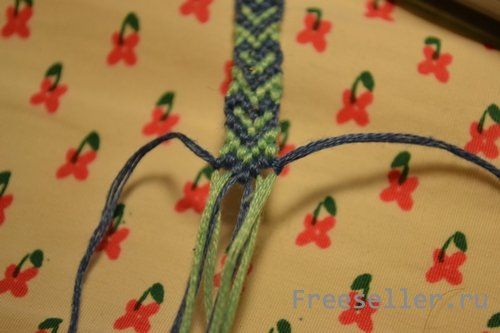 Предпоследними бирюзовыми нитками оплетаем синие с двух сторон. Синей облетаем к серединке ,потом между собой. Опять предпоследними синими оплетаем бирюзовую.