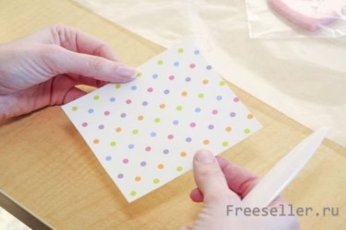 Из упаковочной бумаги вырезаем квадрат, чтобы он подходил по размерам к нашему пакету.