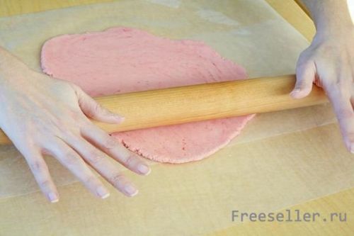 Кладем на стол бумагу для выпекания. Скатываем тесто в шарик и с помощью скалки раскатываем. По толщине не больше 0,3-0,5 мм.