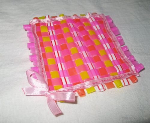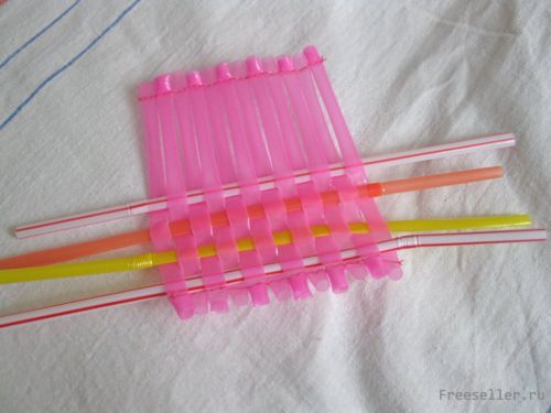 2) Делаем плетение по принципу 1 через 1: вводим соломинку под низ заготовки, потом наверх и т.д., плотно прижимая протянутую соломинку к простроченному краю, следующую соломинку, наоборот, сначала наверх, а потом под низ, и все повторяем до тех пор, пока подставка не будет полностью заполнена 12 соломинками (булавкой помогайте себе вытягивать соломинку);