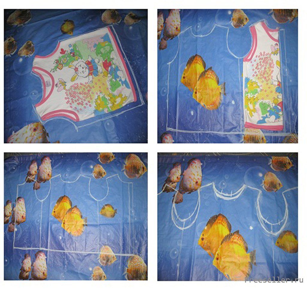 1) Делаем выкройку на занавеску с помощью майки: сначала обводим майку мелом с прибавками на швы и добавляем еще по паре сантиметров с боков, затем складываем ее пополам и дорисовываем половинки, на одной половинке делаем борт для нахлёста, углубляем проймы для рук и горловины (для удобства движения малыша);