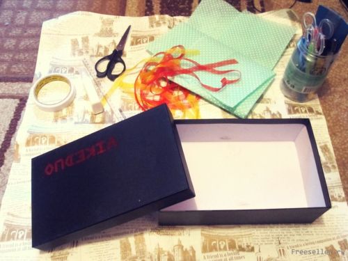Для этого вам понадобится ненужная коробка (можно из под обуви) размером на ваше усмотрение; большой лист нарядной бумаги (для девочек-розово-сердечная, для мальчиков - более сдержанный рисунок). В моем случае - имитация газеты со статьей о любви. Карандаш, линейка, клей, двухсторонний скотч, ножницы, лента нарядная 2 метра.