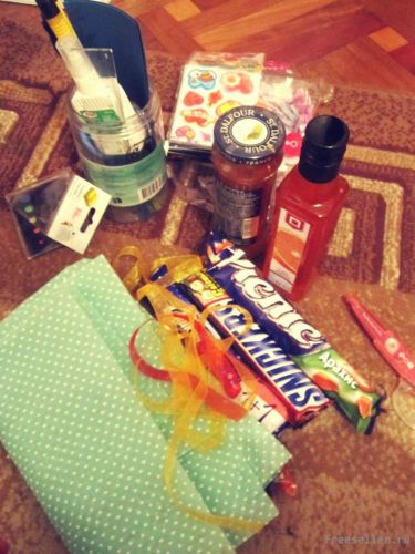 Для этого нам нужно будущее содержимое нижнего слоя коробки (в моем случае-это любимые шоколадки - твикс, сникерс, милка, пикник; импортный ананасово-манговый джем, апельсиновый сироп). Или первый уровень коробки может содержать основной (несъедобный) подарок (если таковой имеется) или другие приятные мелочи. Далее нам понадобится нарядная бумага (у меня нежно-зеленая в крапинку), ножницы, лента метра 3 (желательно разного цвета), лист бумаги для надписей, фигурные ножницы, клей, символические наклейки.