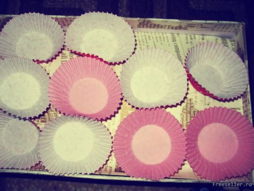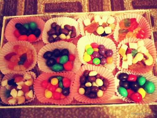 Необходимы бумажные корзинки для выпекания кексов (маффинов) и мелкие конфетки/орешки. Я использовала Скитлс, желатиновых мишек, цукаты на развес, орешки в черном и белом шоколаде. На «мнимое дно» выкладываем плотненько корзинки.