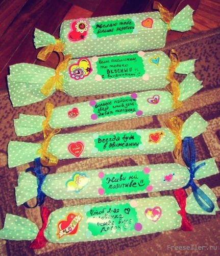 Оборачиваем шоколадки (и др. подарки) как конфетки - на концах завязываем ленточкой бантики. Надписи предварительно записанные на отдельном листке бумаги вырезаем фигурными ножницами, приклеиваем на середину «конфет». Интересно если надпись на конфете соответствует содержимому, например у меня для Твикса надпись - «Чтоб твоя вторая половинка всегда была рядом».